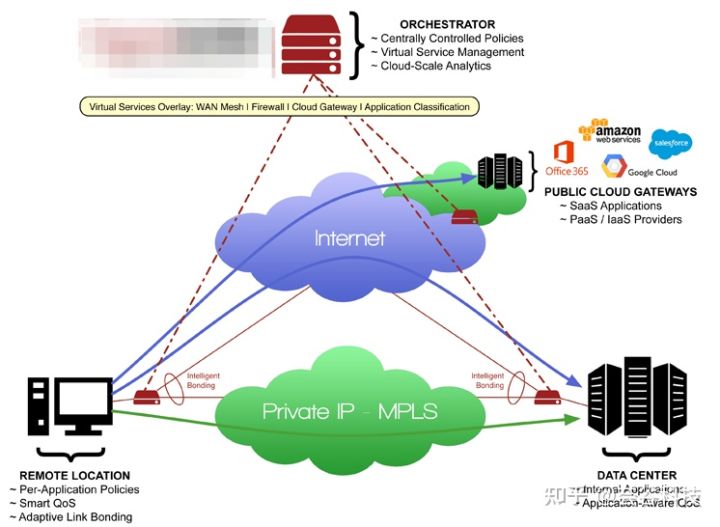 在不同的WAN之間的連接包括有線和無線兩種,有線的服務如MPLS、T1、承載以太或者商業寬帶鏈路等;無線技術包括蜂窩數據網絡,如4G LTE,以及公共wifi或者衛星通信。